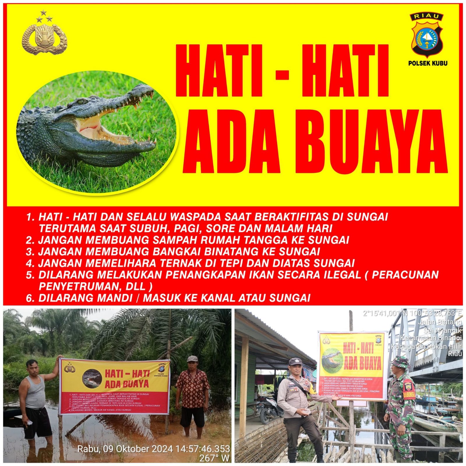Rokan Hilir | • Oleh Chan • 11 Oktober 2024 • Jaga Kamtibmas Pilkada, Kapolsek Diminta Pasang Spanduk Imbauan Hati-hati Buaya Rohil, derap1news – Beberapa bulan belakangan ini warga Rohil yang berada di Perairan Sungai Rokan...