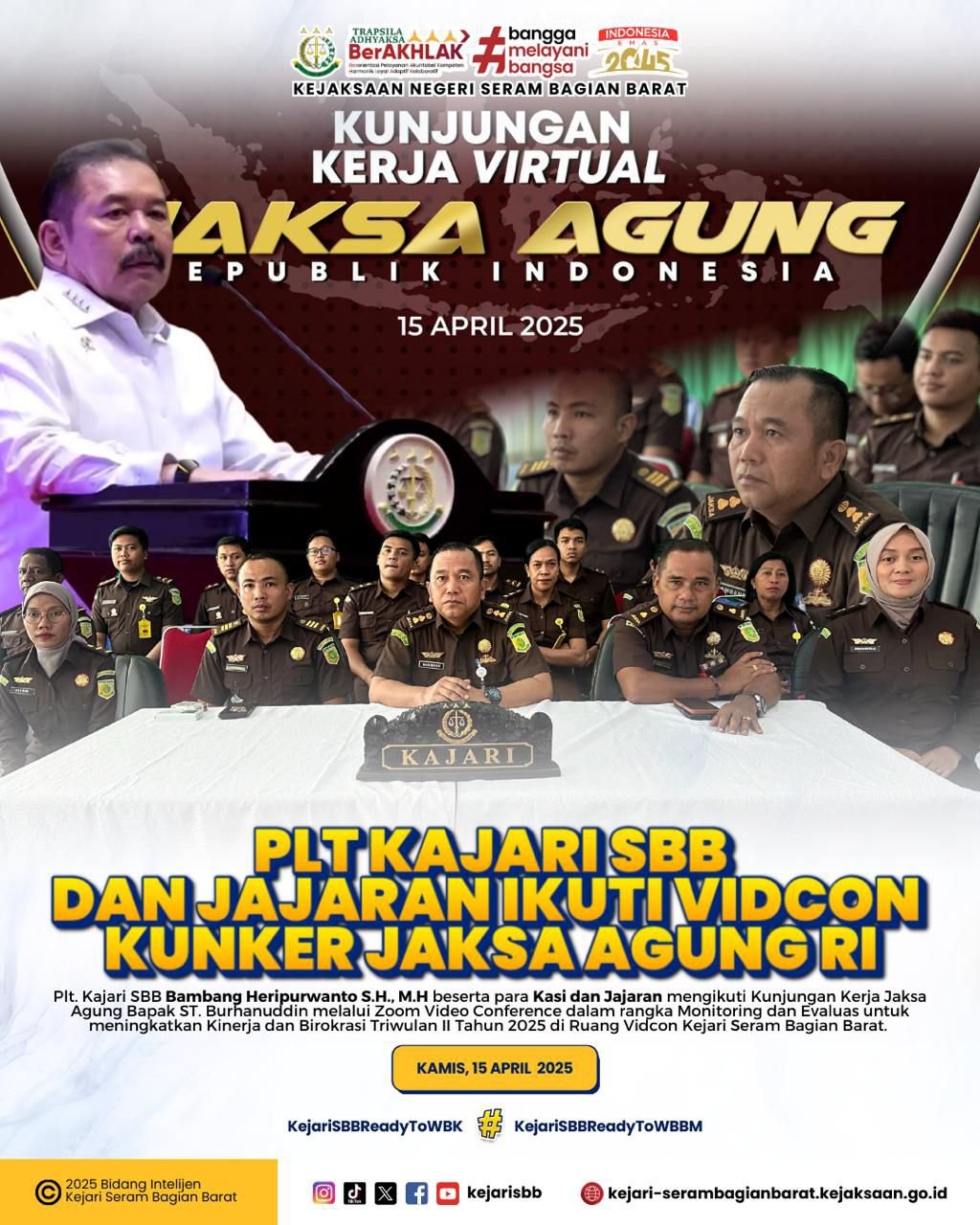 Mitra Derap1news | • Oleh Chan • 15 April 2025 • 2 Dilihat • Plt. Kajari SBB dan Jajaran Ikuti Kunjungan Kerja Virtual Jaksa Agung RI, Dorong Peningkatan Kinerja dan Reformasi Birokrasi di Triwulan II 2025 SBB, derap1news – Plt. Kepala Kejaksaan Negeri Seram Bagian Barat (Kajari SBB), Bambang Heripurwanto, S.H.,...
