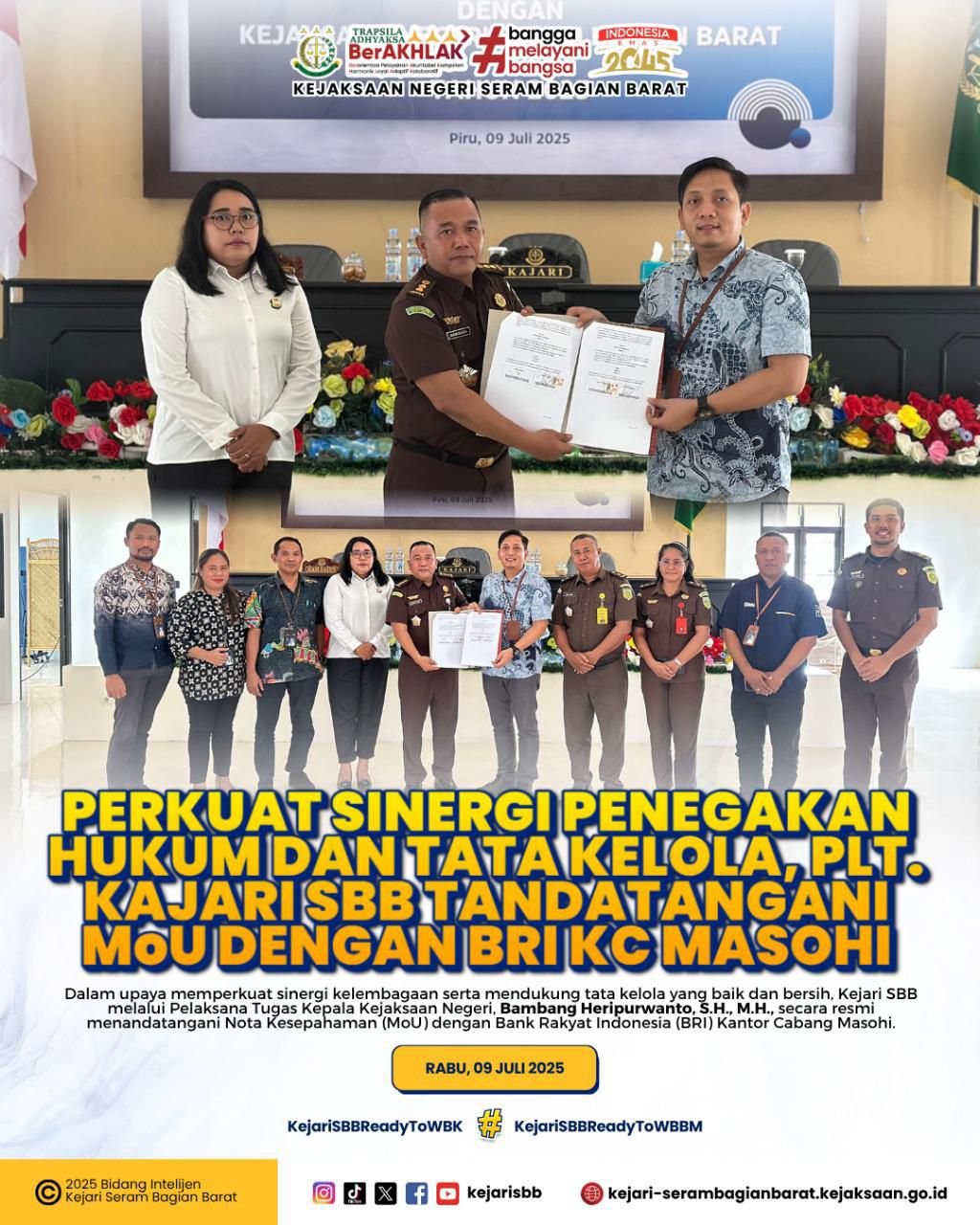 Mitra Derap1news | • Oleh Chan • 9 Juli 2025 • 4 Dilihat • Penandatanganan MoU antara BRI KC Masohi dengan Kejari Seram Bagian Barat, Plt. Kajari SBB: Perkuat Sinergi Penegakan Hukum dan Tata Kelola Keuangan Piru, derap1news – Dalam upaya memperkuat sinergi kelembagaan serta mendukung tata kelola yang baik dan...