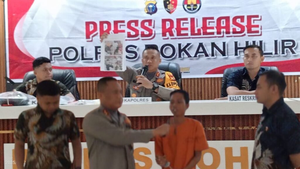 Rohil, derap1news – Kepolisian Resor Rokan Hilir menggelar konferensi pers terkait pengungkapan kasus pembunuhan yang mengguncang masyarakat Kecamatan Pasir Limau Kapas. Seorang pria berinisial MA alias Sulung Siregar (25), berprofesi sebagai petani, ditangkap setelah diduga membunuh adik kandungnya sendiri, RF alias Rifka (20), hanya karena permintaan uang sebesar Rp500 ribu ditolak.