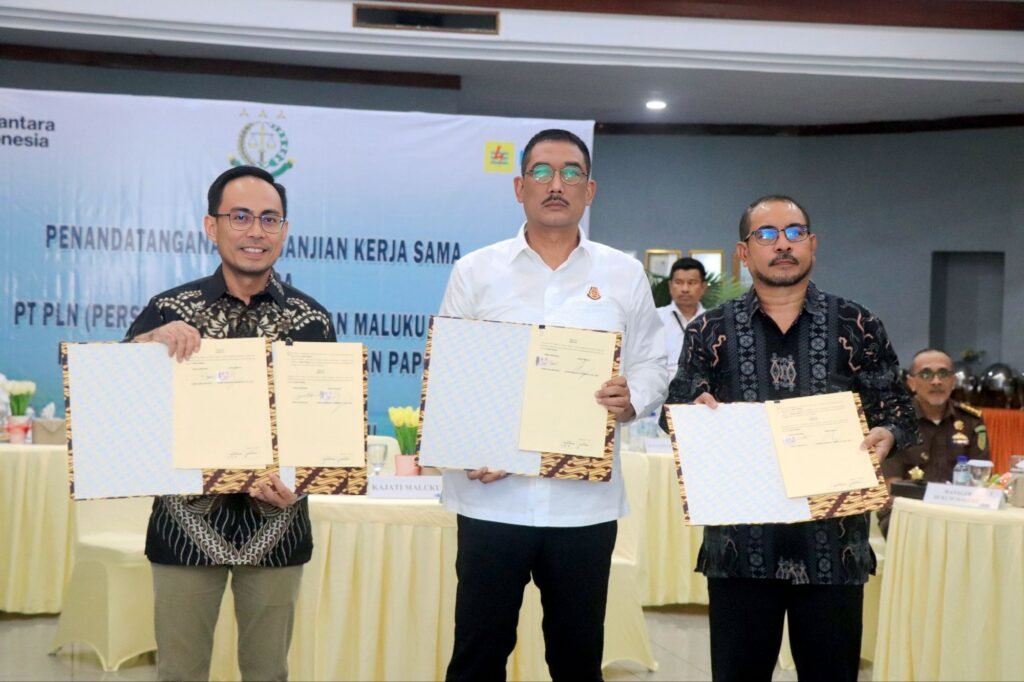 MALUKU – Ambon, Kepala Kejaksaan Tinggi Maluku Agoes Soenanto Prasetyo, S.H.,M.H bersama General Manager PT. PLN (Persero) Wilayah Maluku – Maluku Utara Awat Tuhuloula, melakukan Penandatanganan Perjanjian Kerjasama (MoU) yang dilaksanakan secara Virtual dengan Kejaksaan Agung RI dan Komisaris Utama serta Direktur Utama PT. PLN (Persero) melalui sarana Zoom Meeting di Kantor PLN UIW MMU, Jl. Diponegoro Kota Ambon, pada hari ini Senin (14/07/2025).