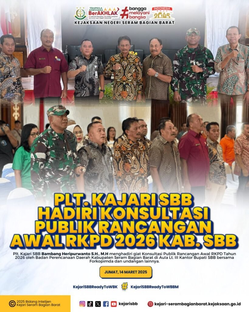 Piru, derap1news –  Pelaksana Tugas (Plt.) Kepala Kejaksaan Negeri (Kajari) Seram Bagian Barat (SBB), Bambang Heripurwanto, S.H., M.H., menghadiri kegiatan Konsultasi Publik Rancangan Awal Rencana Kerja Pemerintah Daerah (RKPD) Tahun 2026 yang diselenggarakan oleh Badan Perencanaan Daerah Kabupaten Seram Bagian Barat. Acara ini berlangsung di Aula Lantai III Kantor Bupati SBB dan dihadiri oleh unsur Forum Koordinasi Pimpinan Daerah (Forkopimda) serta para undangan lainnya.
