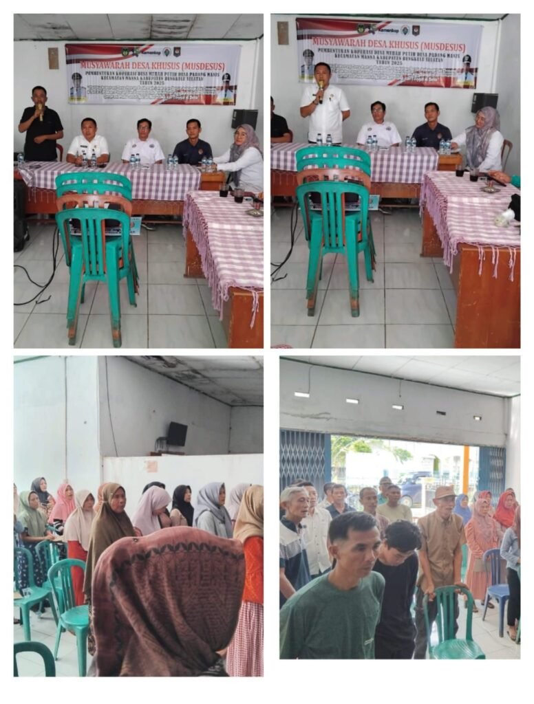 Bengkulu Selatan, derap1news – Pemerintah Desa Padang manis Kecamatan Manna Kabupaten Bengkulu Selatan menggelar Musyawarah Desa Khusus (Musdessus) dalam rangka pembentukan Koperasi Desa Merah Putih. Kegiatan ini berlangsung di Aula Kantor Desa Padang manis pada Rabo, (04/06/2025).