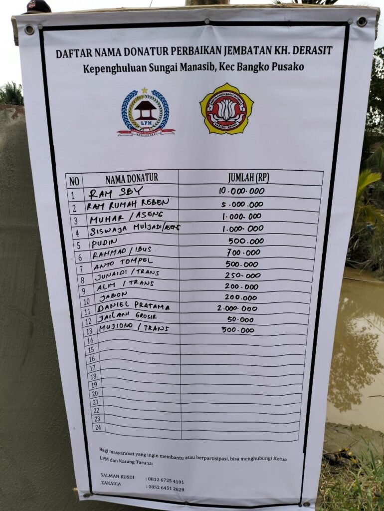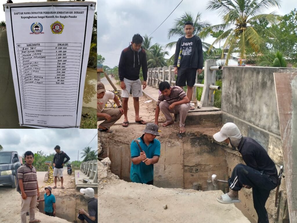 Melihat kondisi tersebut, Daniel Pratama,SH.MH selaku tokoh pemuda Sungai Manasib bersama Ketua LPM, Ketua Karang Taruna, dan sejumlah pemuda lainnya bergerak cepat memperbaiki bagian jalan dan jembatan yang rusak.