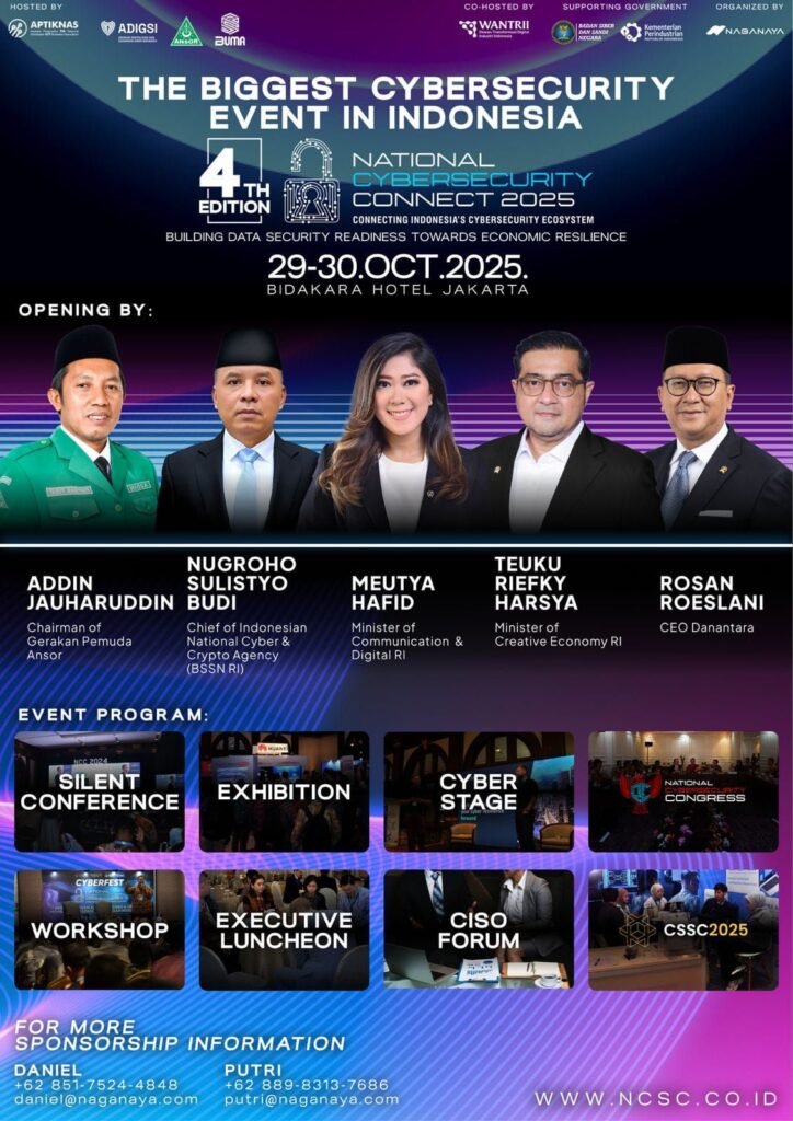 Hoky menyampaikan apresiasi atas dukungan luas yang diterima. “Saya merasa terhormat event ini didukung oleh banyak pihak, termasuk rencana kehadiran Kepala BSSN RI Nugroho Bapak Sulistyo Budi, Menteri Kominfo Ibu Meutya Hafid, Menteri Ekraf Bapak Teuku Riefky Harsya, dan CEO Danantara Bapak Rosan Roeslani dalam opening ceremony. Ini semua berkat dukungan PT Naganaya, ADIGSI, dan GP Ansor,” ungkapnya.