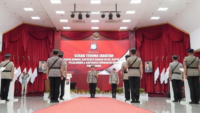 Kepala Kepolisian Daerah Riau (Kapolda Riau) gelar acara serah terima jabatan 3 Kapolres dan Kabid Humas Polda Riau. Kegiatan ini langsung dipimpin oleh Kapolda Riau, Irjen M Iqbal.pada Kamis, 18/07/2024.