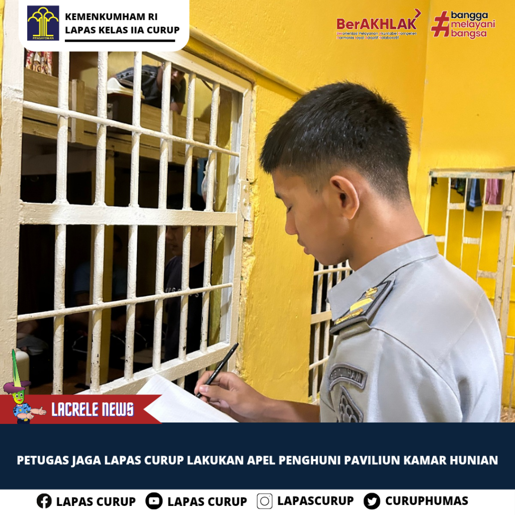 Petugas jaga di Lembaga Pemasyarakatan (Lapas) Kelas IIA Curup, Rabu ,(10/07/2024) kembaliĀ melaksanakan apel penghuni kamar hunian sebagai bagian dari rutinitas untuk memastikan keamanan dan ketertiban di dalam lapas.