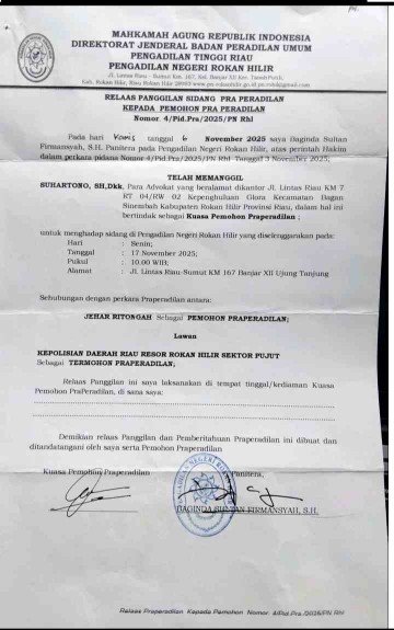 Rokan Hilir — Kuasa hukum tersangka Jehar Ritonga dari Kantor Hukum Hartono & Rekan melayangkan surat keberatan kepada Ketua Pengadilan Negeri (PN) Rokan Hilir, Ketua Pengadilan Tinggi Riau, serta Kantor Penghubung Komisi Yudisial Provinsi Riau. Mereka mempertanyakan alasan sidang praperadilan dengan Register Nomor 4/Pid.Pra/2025/PN Rhl yang telah didaftarkan sejak 3 November 2025, namun tidak muncul dalam Sistem Informasi Penelusuran Perkara (SIPP) PN Rokan Hilir hingga saat ini.
