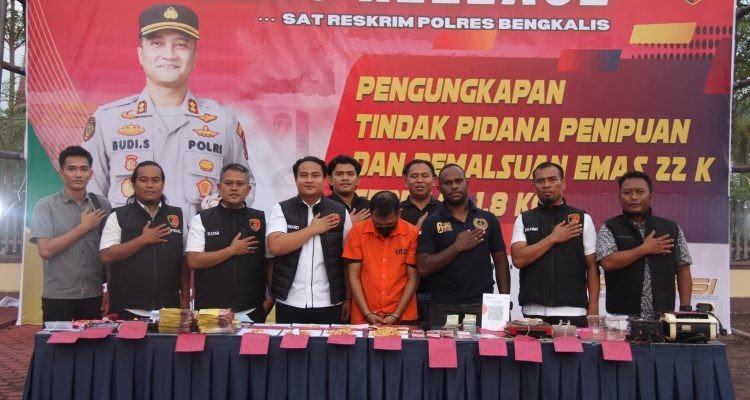 BENGKALIS,Derap1news – Satuan Reserse Kriminal Polres Bengkalis berhasil mengungkap praktik pemalsuan emas yang telah berlangsung sejak tahun 2021, dengan mengamankan satu tersangka berinisial MI (48), pemilik Toko Mas Samudra yang berlokasi di Jalan Jenderal Sudirman, Pasar Duri, Kecamatan Mandau.
