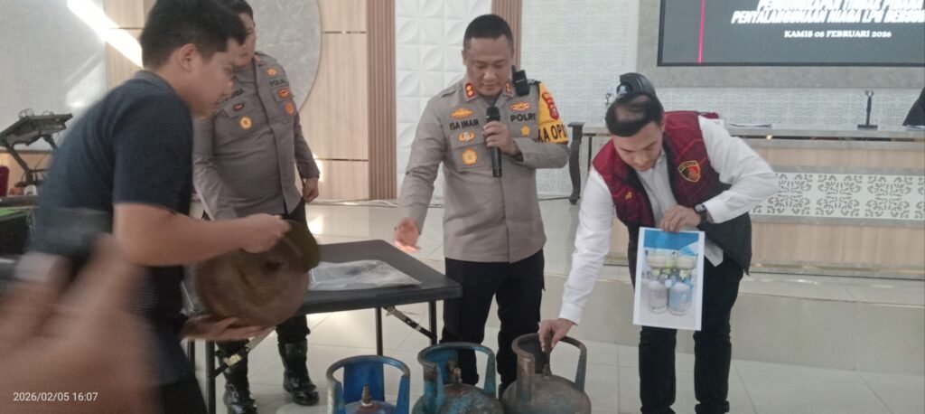 Dalam acara konprensi pers yang digelar di Gedung Serba Guna Tunggal Panaluan pada Kamis (5/2/2026) , Kapolres Rohil AKBP Isa Imam Syahroni S.H S.IK didampingi Kasat Reskrim AKP I Putu Adi Juniwinata, S.Tr.K., S.I.K., M.Si. menjelaskan kepada awak media dalam pengungkapan ini, tiga orang terduga pelaku diamankan bersama ratusan tabung gas dan perlengkapan alat penyulingan.” Ujarnya