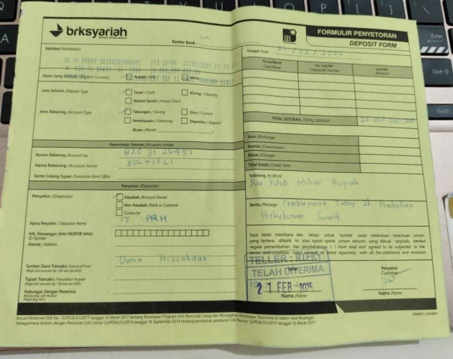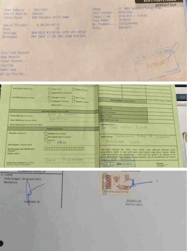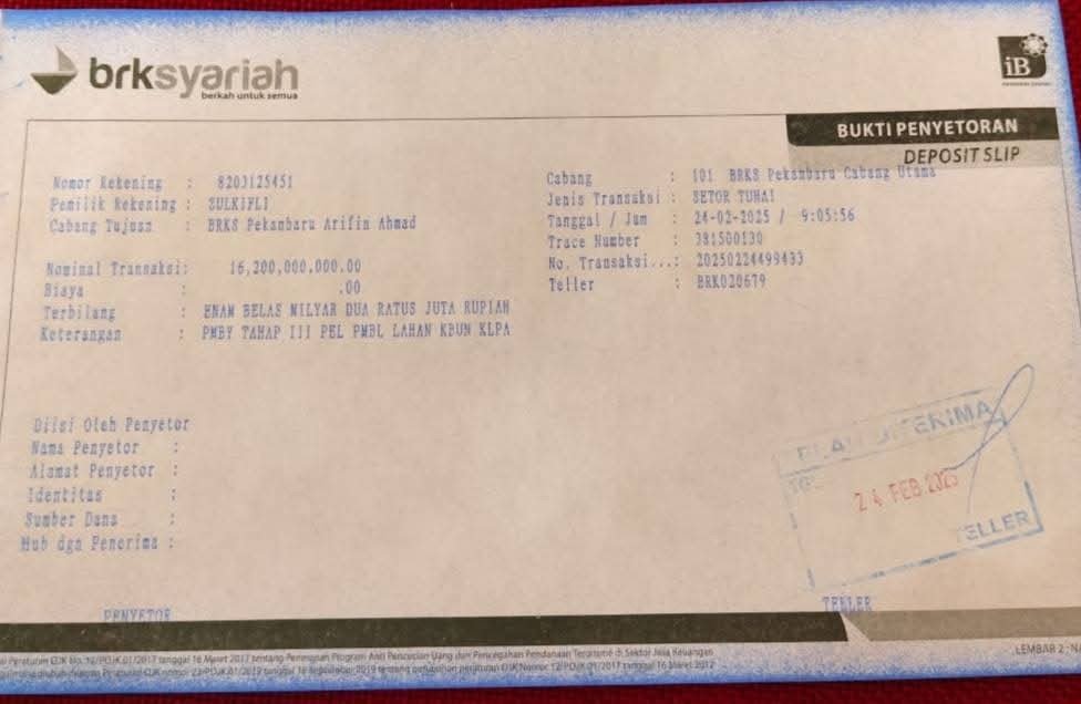 Tahap III: 24 Februari 2025, pembayaran sebesar Rp16,2 miliar kembali mengalir kepada Zulkifli SH untuk pembelian lahan kebun sawit.