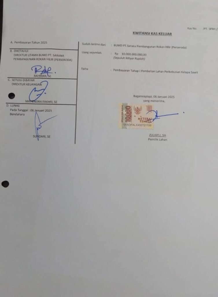 Berdasarkan dokumen bukti kwitansi pembayaran yang beredar, pengacara berinisial Z diduga menerima kucuran dana fantastis dari PT SPRH sebesar Rp46 miliar, yang disebutkan terkait pembelian lahan perkebunan kelapa sawit di Rokan Hilir.
