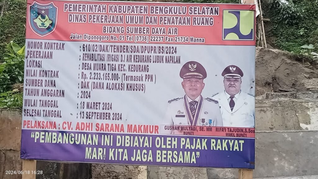 Bengkulu Selatan, Derap1News – Pemerintah Kabupaten Bengkulu Selatan melalui Dinas Pekerjaan Umum dan Penataan Ruang (PUPR) bidang Sumber Daya Air, lakukan rehabilitasi Irigasi D.I air Kedurang Lubuk Napalan Desa Muara Tiga Kecamatan Kedurang.